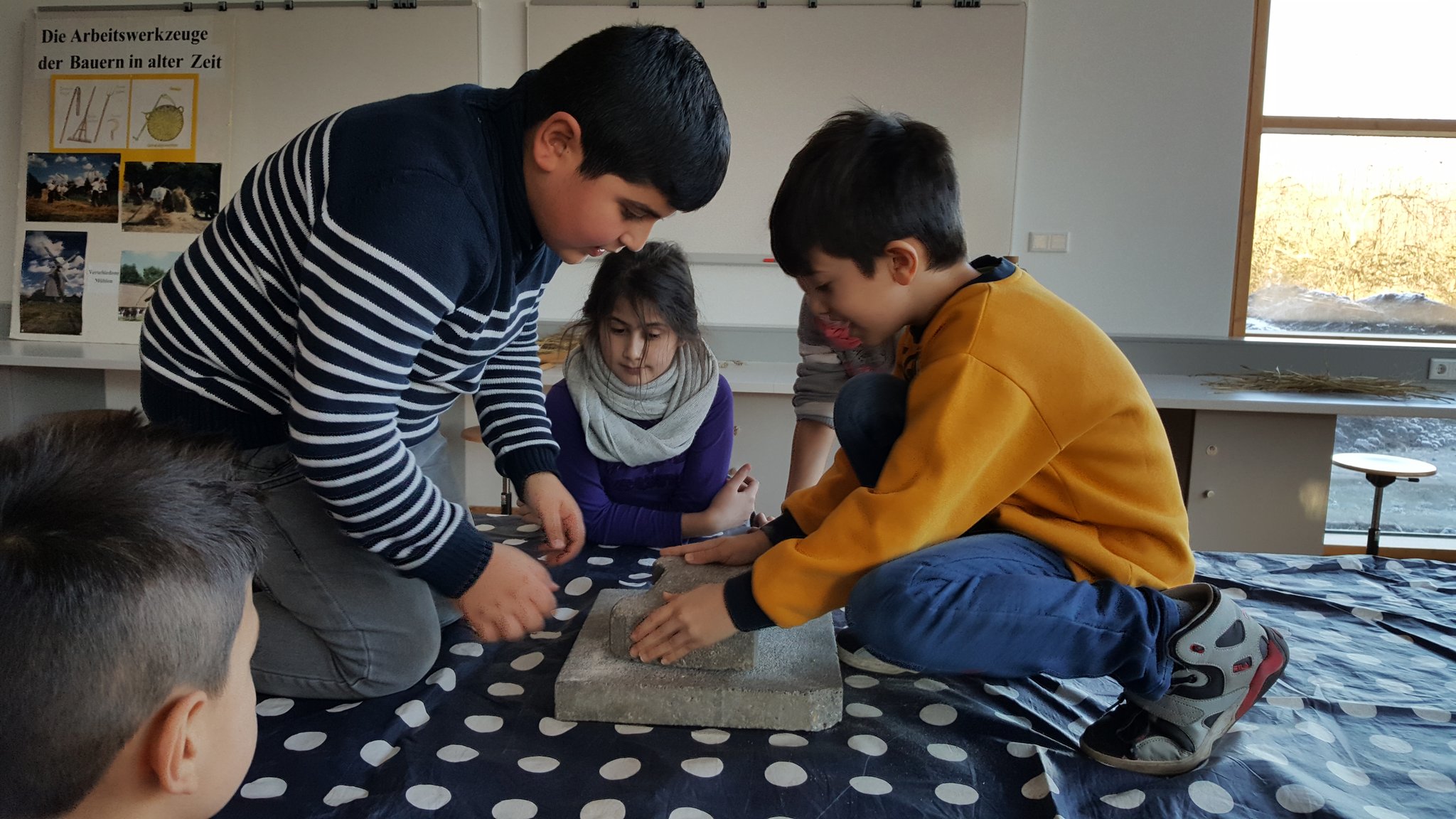 Nach einem Rundgang durch den herbstlichen Rombergpark arbeiten die Schüler/innen in den neuen Klassenzimmern der Grünen Schule. Nachdem die Kinder selber Mehl hergestellt haben, wird Brot gebacken.